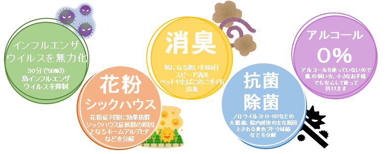 ・室内、社内、家具、敷物、布製品、トイレ、ベビー用品、ペット用品、介護用品など身の回り品の除菌消臭